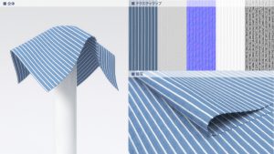 シミュレーション*した際にシルエットに影響するデータ(重量・厚み・曲げ強度・引張強度などの物性情報を元に計算して作られたデータ)と、レンダリング*時に表面の質感を表現するためのテクスチャデータ(カラー・反射率・細かい凹凸・透明度などを表す画像)を組み合わせて、デジタルで再現した生地です。